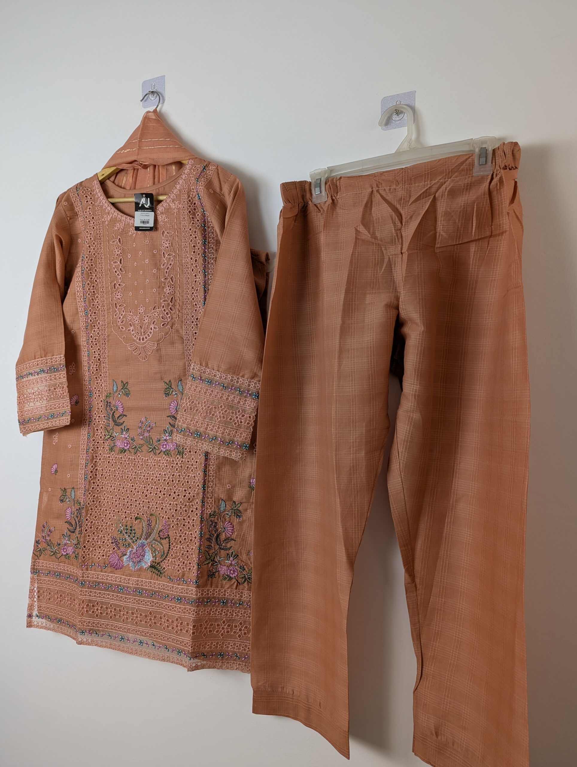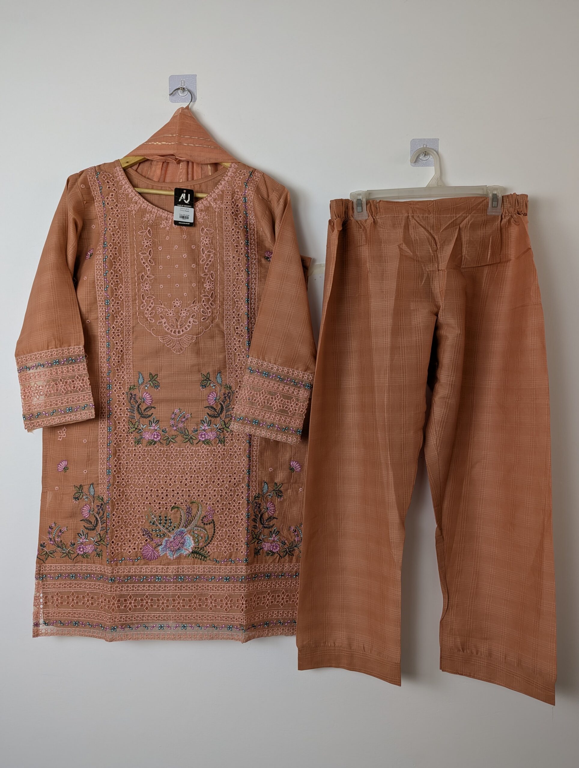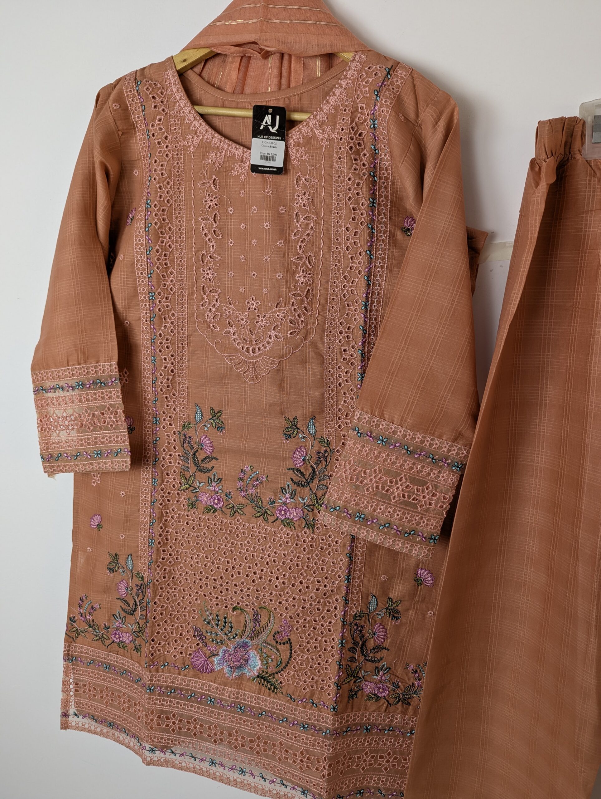 Introducing a stunning ethnic ensemble that radiates charm! This beautiful outfit features a delicately embroidered kurta in a warm peach hue, adorned with intricate floral patterns and lace detailing, perfect for festive occasions. Paired with comfortable matching trousers, this set ensures both style and ease. The breathable fabric makes it ideal for all-day wear. Elevate your wardrobe with this delightful addition that celebrates tradition with a modern twist! 😊