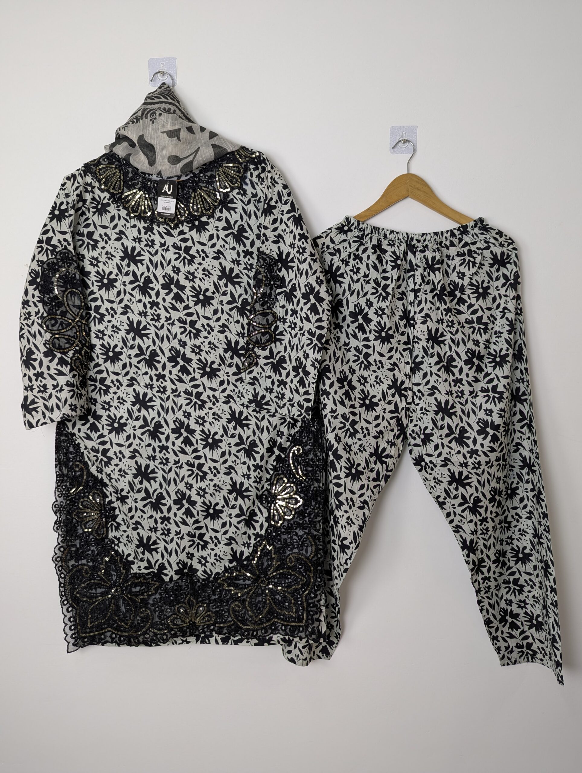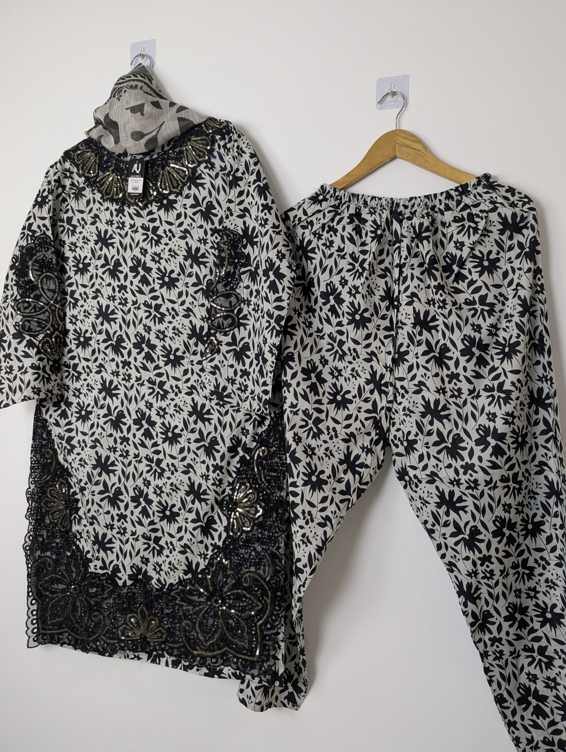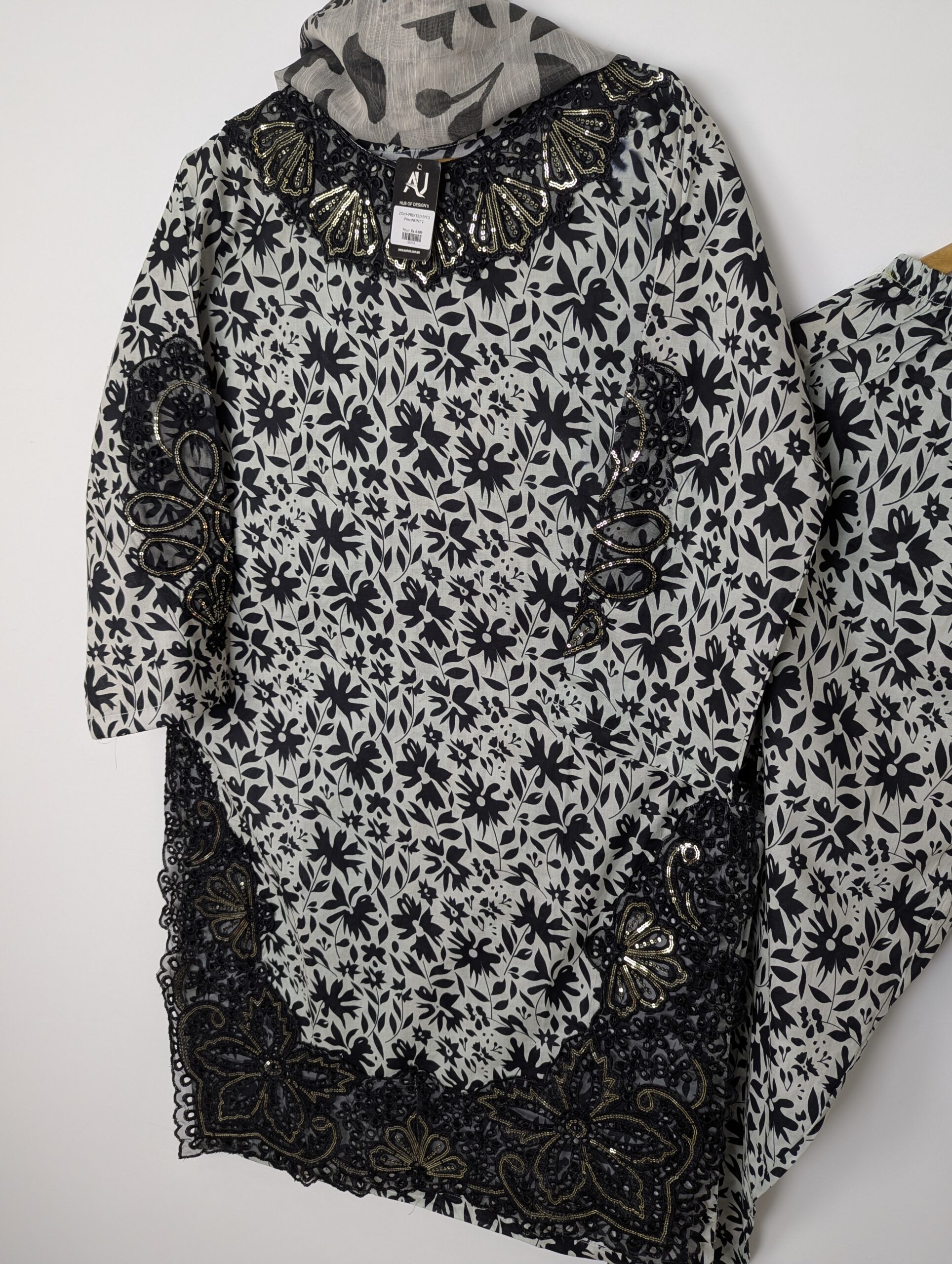Introducing our stunning 3-piece lawn set, article no. ZOH9! This beautiful ensemble features intricate patchwork embroidery that adds a touch of elegance to your wardrobe. The delicate floral print in soft hues is perfect for any occasion, making it a versatile choice for both casual outings and festive gatherings. With its comfortable fit and stylish design, you’ll feel fabulous and confident every time you wear it. Elevate your style with this must-have piece!
