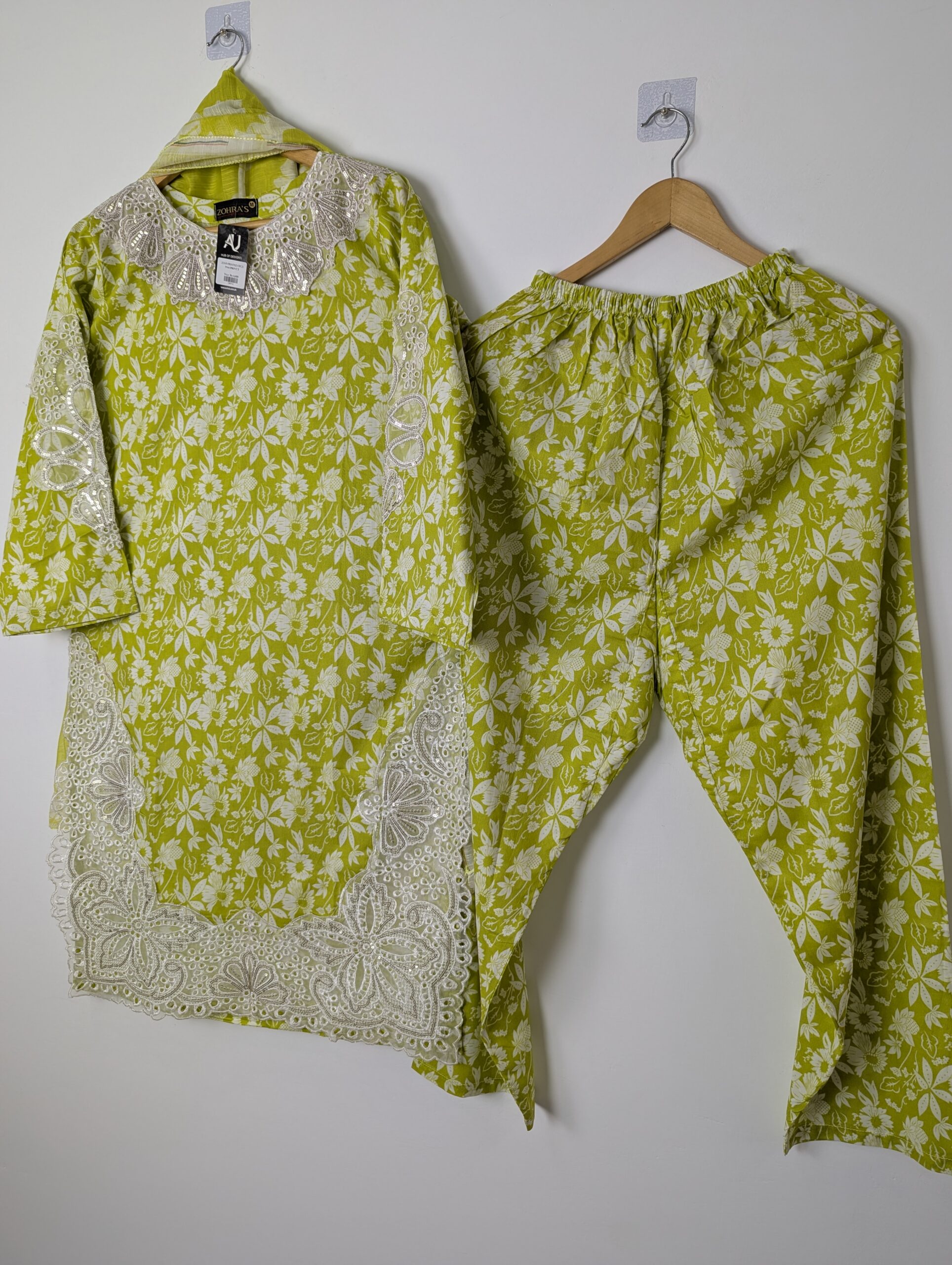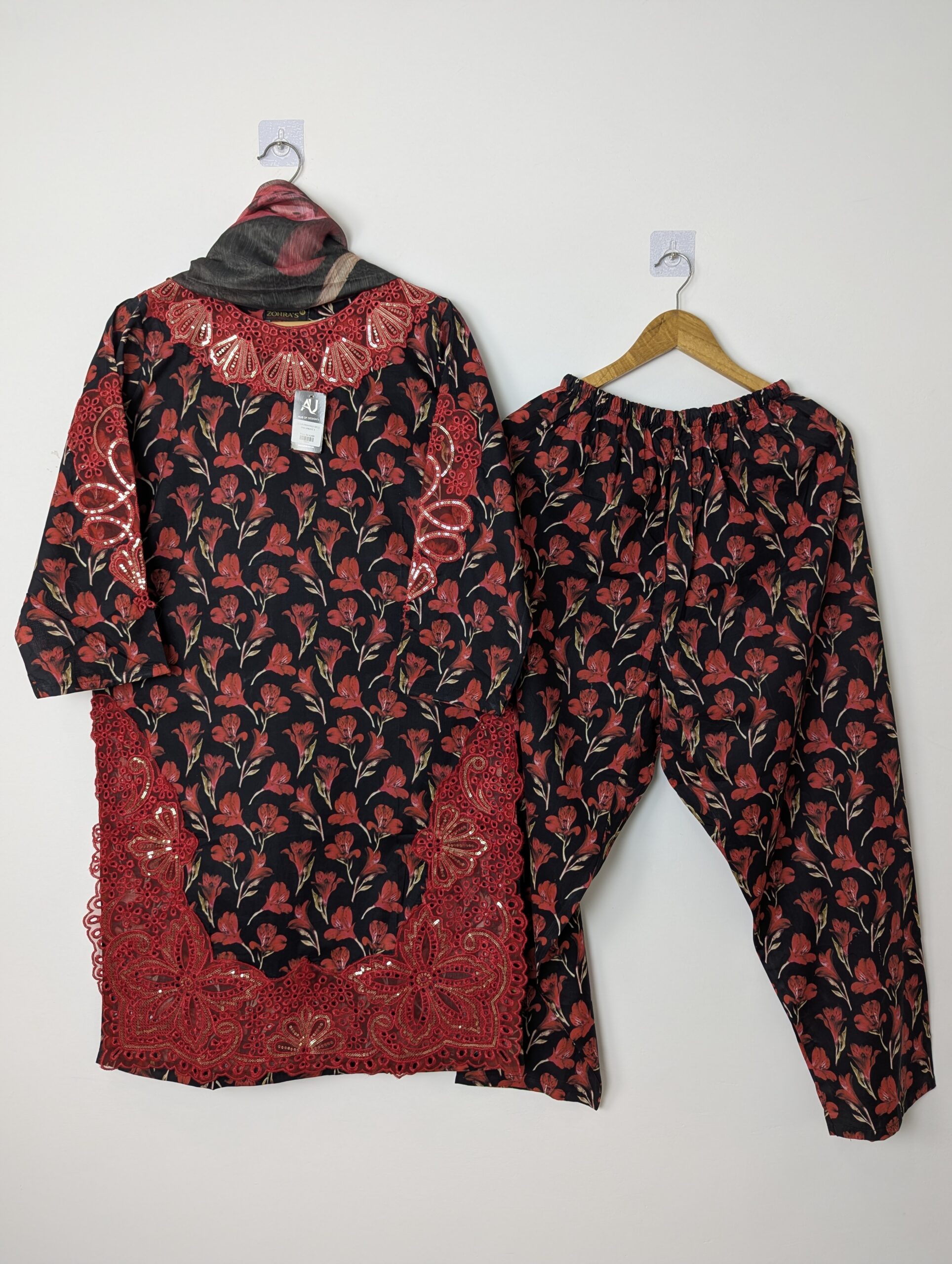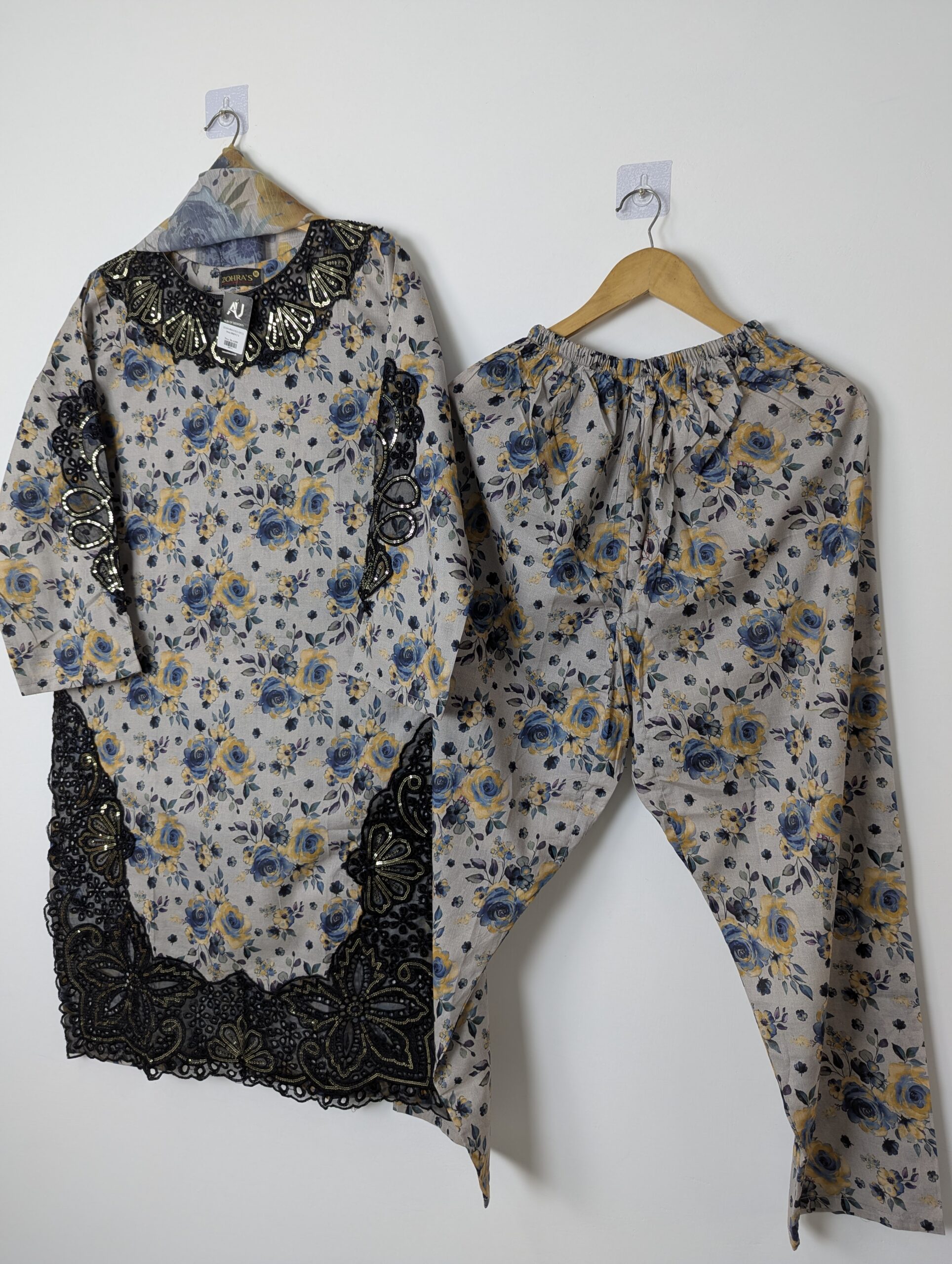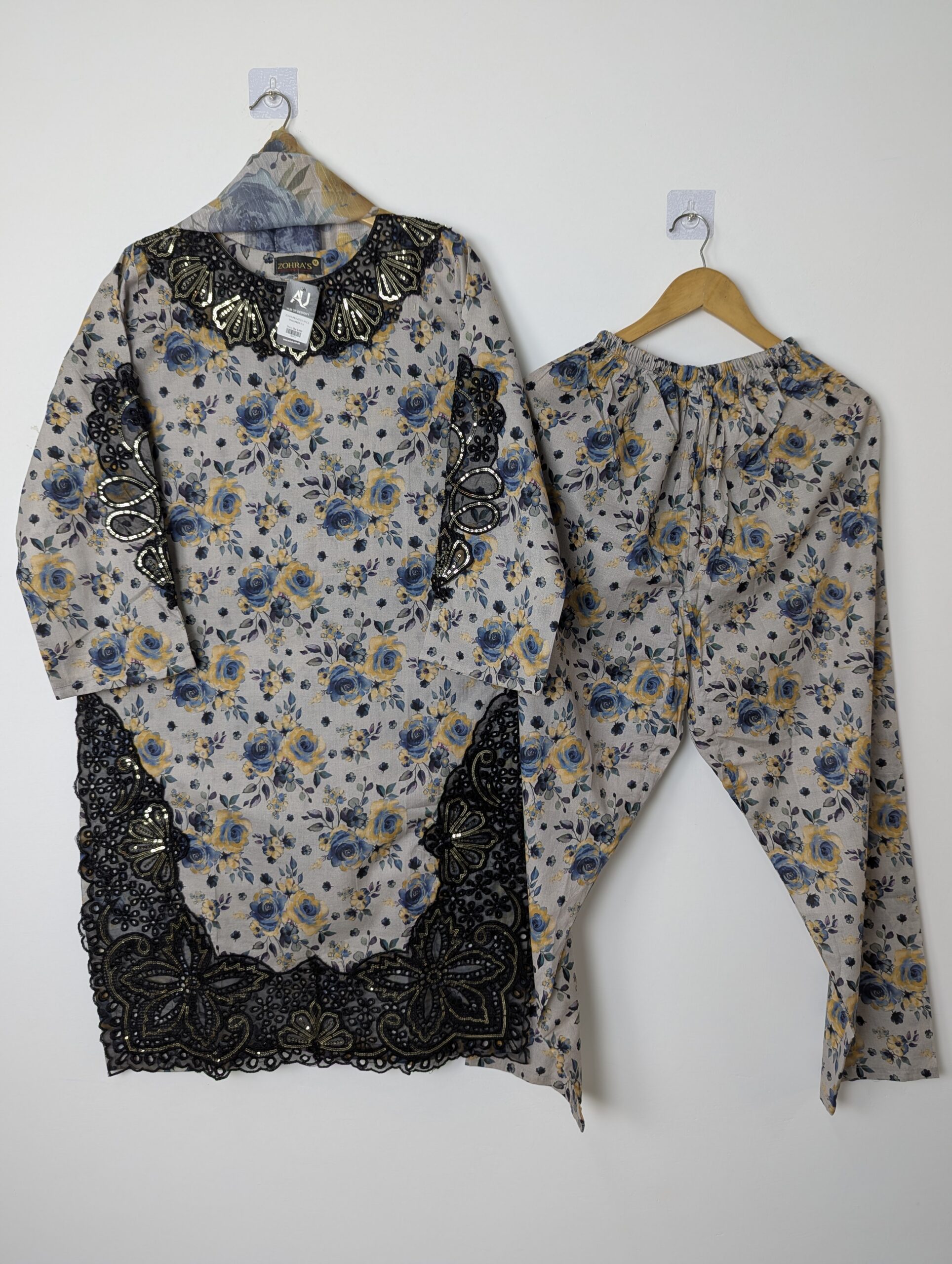 Introducing our stunning 3-piece lawn set, article no. ZOH9! This beautiful ensemble features intricate patchwork embroidery that adds a touch of elegance to your wardrobe. The delicate floral print in soft hues is perfect for any occasion, making it a versatile choice for both casual outings and festive gatherings. With its comfortable fit and stylish design, you’ll feel fabulous and confident every time you wear it. Elevate your style with this must-have piece!